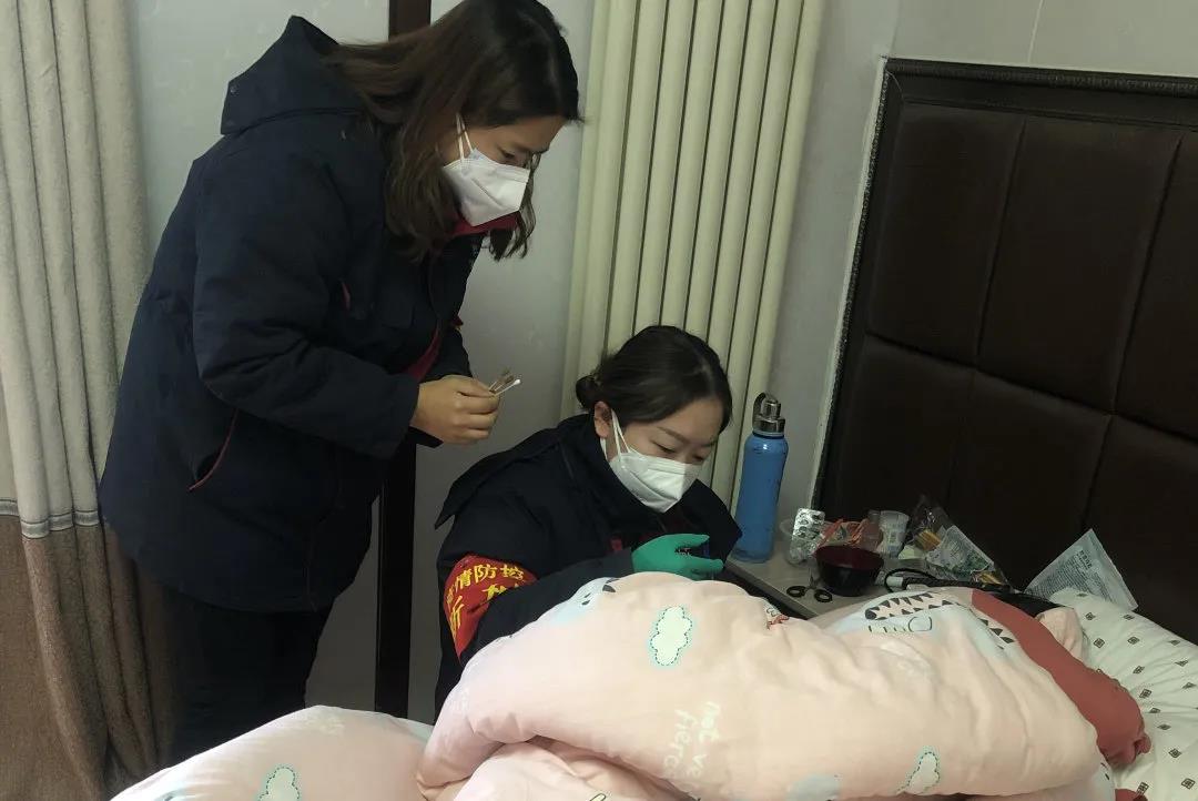 社區(qū)工作人員在為賈女士打針。新城區(qū)委組織部供圖