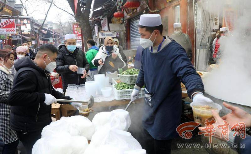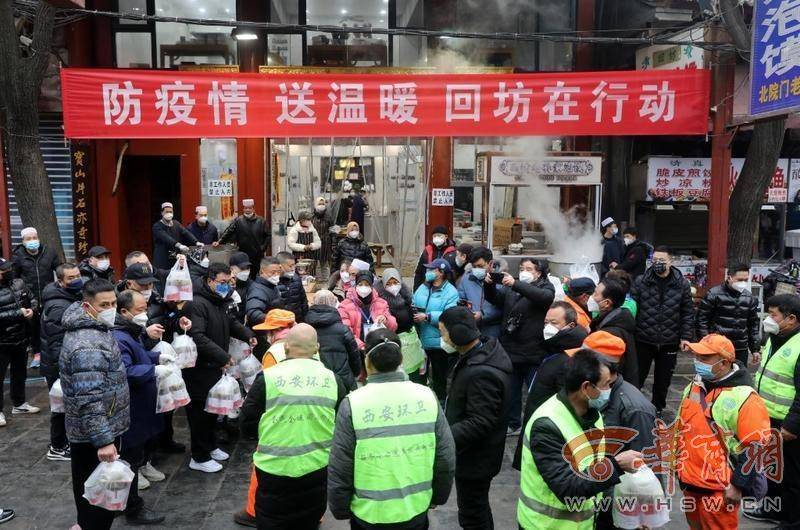 在回民街回坊老孫家泡饃店,服務(wù)員正在給周邊環(huán)衛(wèi)工免費提供午飯。“自疫情嚴(yán)控以來,我們每天為周邊參加一線防疫工作者近千份清真熟食,以感謝他們對西安市防疫做出的貢獻(xiàn)。”該店負(fù)責(zé)人說。