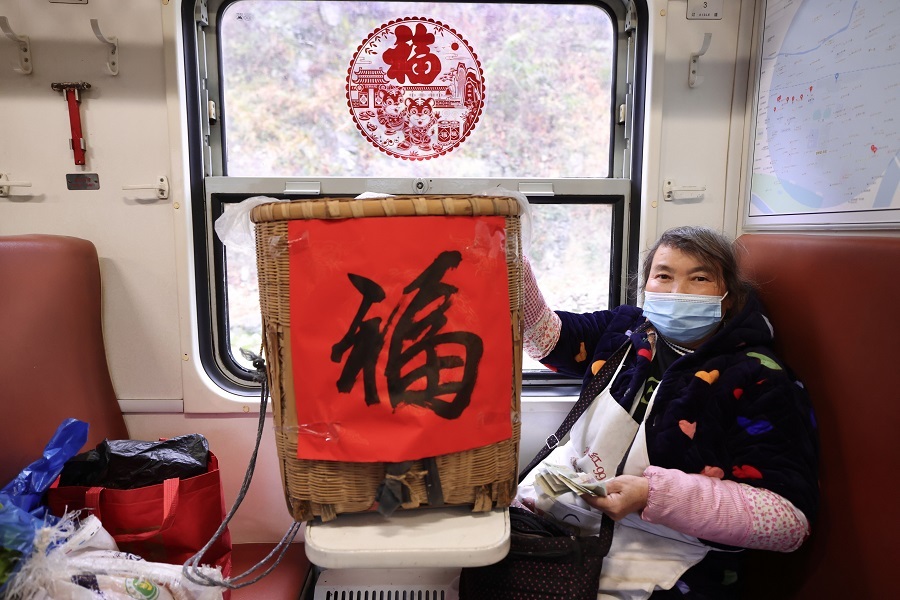 “各位老鄉(xiāng),早上好,今天是農(nóng)歷小年,我們將舉行送祝?;顒印?rdquo;列車員衛(wèi)進忠的話音剛落,就看見車廂里老鄉(xiāng)們急忙圍攏過來。他把寫好的春聯(lián)送給身邊背著背簍的一位老人,將一張福字貼在了背簍上。拿到對聯(lián)、福字的老人滿臉笑容,連忙道謝。“火車快開, 別讓我等待,火車快開,請你趕快送我到遠方家鄉(xiāng)……”在與旅客互動中,列車員李愛民激情演唱歌曲《火車快開》,送去列車工作人員的新春祝福,引來旅客們陣陣掌聲。