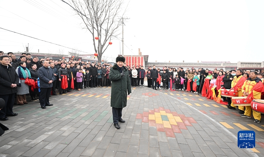 1月26日至27日,中共中央總書記、國(guó)家主席、中央軍委主席習(xí)近平來到山西,看望慰問基層干部群眾。這是26日下午,習(xí)近平在臨汾市汾西縣僧念鎮(zhèn)段村文化廣場(chǎng),給鄉(xiāng)親們拜年,向全國(guó)各族人民、向港澳臺(tái)同胞和海外僑胞致以美好的新春祝福。新華社記者 李學(xué)仁 攝