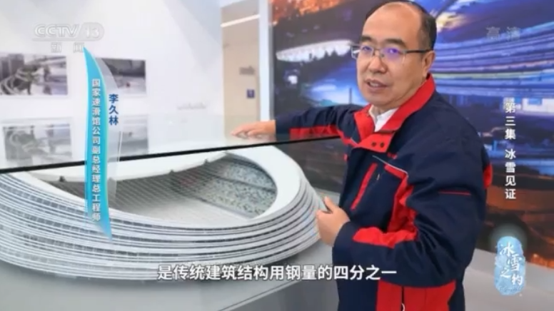 國(guó)家速滑館公司副總經(jīng)理、總工程師 李久林:通過張拉這個(gè)索,就像做網(wǎng)球拍一樣,只用了幾百噸的鋼絲就可以實(shí)現(xiàn)大型體育場(chǎng)館的屋頂,是傳統(tǒng)建筑結(jié)構(gòu)用鋼量的四分之一。