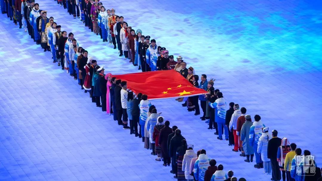△東道主中國(guó)代表團(tuán)入場(chǎng),兩名持旗手分別是中國(guó)鋼架雪車女將趙丹和速度滑冰名將高亭宇。(總臺(tái)記者廖江衡拍攝)