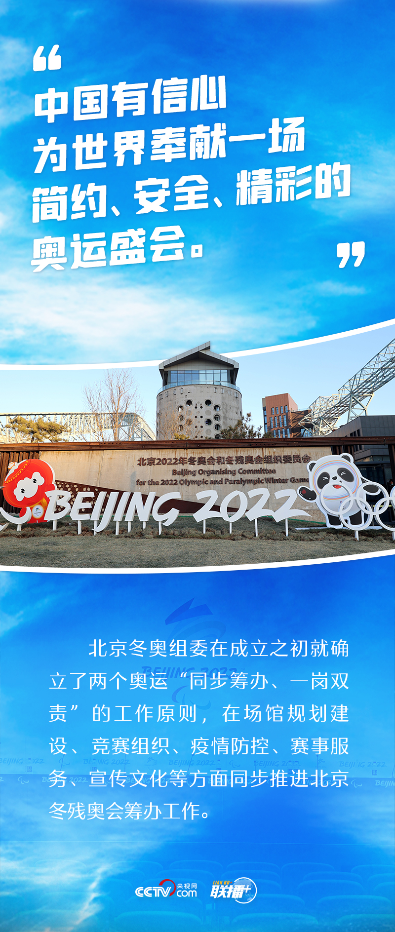 “兩個奧運,同樣精彩”,這是中國的莊嚴承諾。2015年夏天,北京攜手張家口獲得2022年冬奧會和冬殘奧會舉辦權。此后六年多,北京冬奧組委始終堅持兩個奧運“同步籌辦、一崗雙責”的工作原則,在場館規(guī)劃建設、競賽組織、疫情防控、賽事服務、宣傳文化等方面積極推進籌辦工作,努力為廣大運動員提供一流的競賽場地和賽事服務,創(chuàng)造良好的參賽體驗和參賽環(huán)境。