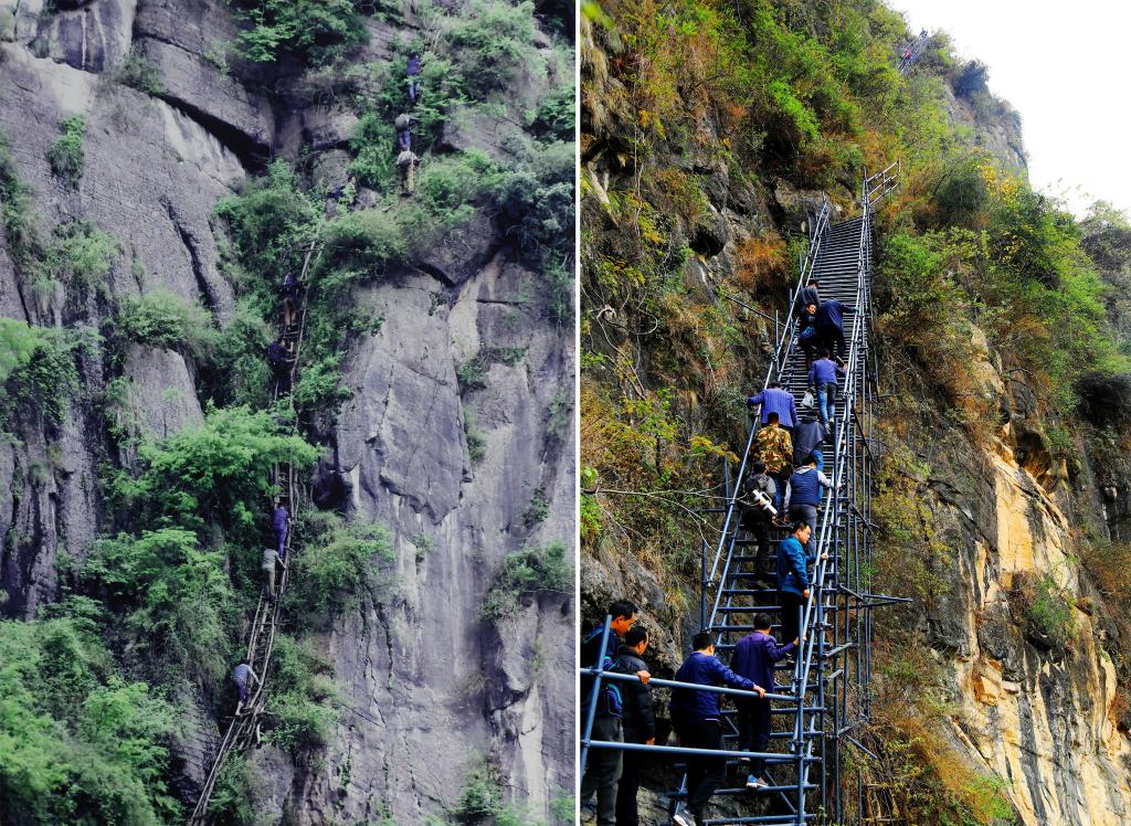 懸崖峭壁上,一個(gè)是歪歪扭扭的簡(jiǎn)易藤梯,另一個(gè)則是改建后同時(shí)用于旅游的鋼梯。
