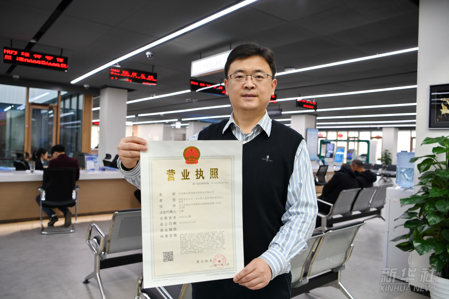 一家入駐雄安新區(qū)的企業(yè)工作人員在市民服務(wù)中心內(nèi)展示辦理的營業(yè)執(zhí)照(2019年1月17日攝)。