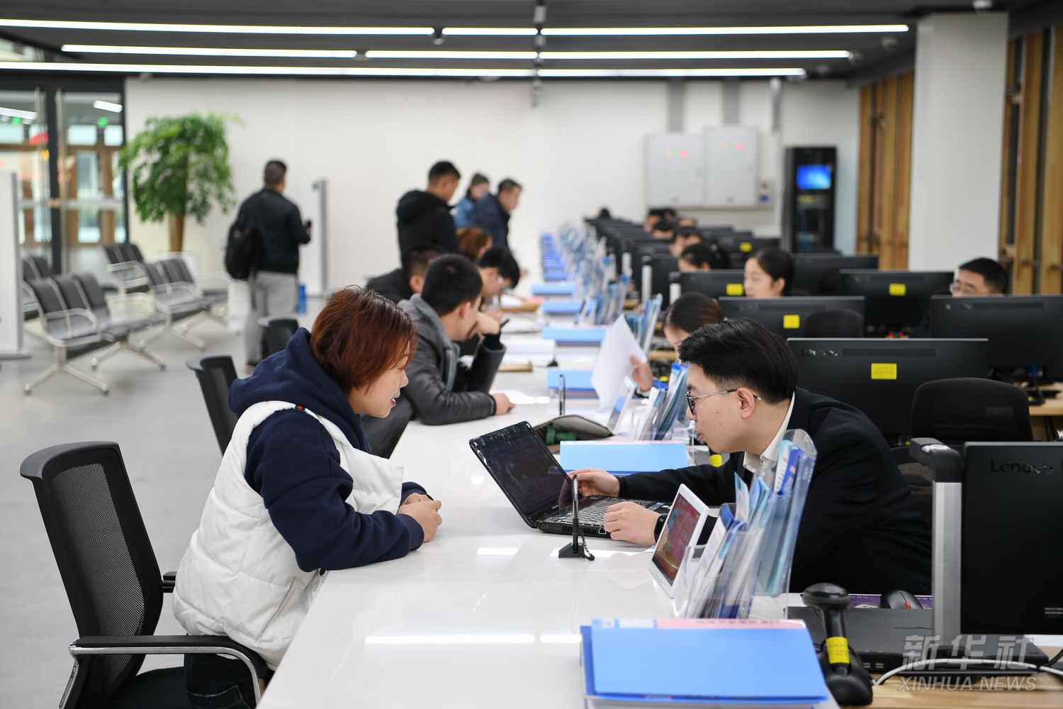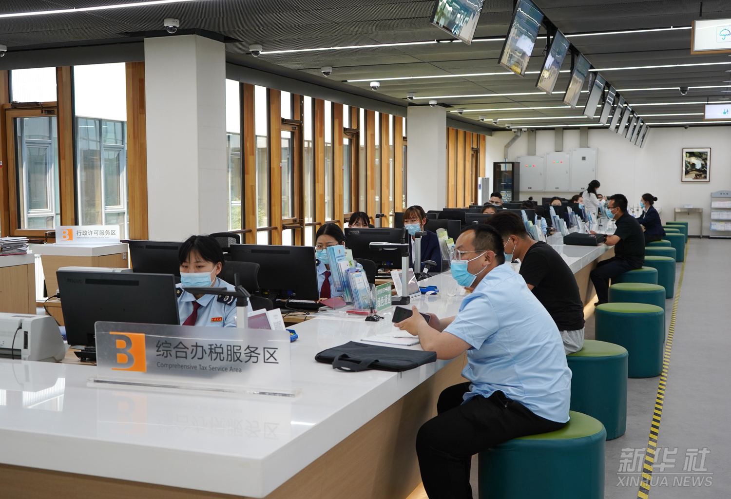 工作人員在河北雄安新區(qū)政務(wù)服務(wù)中心綜合辦稅服務(wù)區(qū)為居民辦理業(yè)務(wù)(2021年5月12日攝)。雄安新區(qū)政務(wù)服務(wù)中心成立于2018年5月30日,為企業(yè)和個(gè)人提供“一站式”行政審批事項(xiàng)受理和便民業(yè)務(wù)受理。
