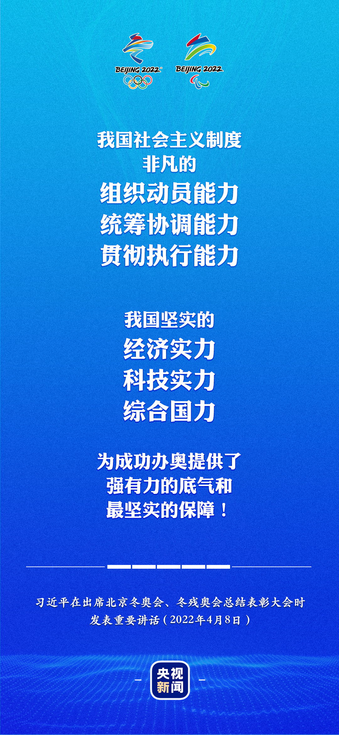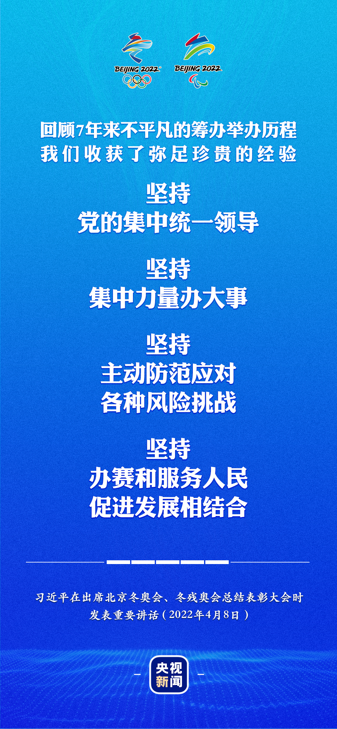 第一,堅(jiān)持黨的集中統(tǒng)一領(lǐng)導(dǎo)。黨中央高度重視北京冬奧會(huì)、冬殘奧會(huì),成立冬奧會(huì)工作領(lǐng)導(dǎo)小組,從國(guó)家層面統(tǒng)籌力量、協(xié)調(diào)推進(jìn)籌辦工作?;I辦之初,黨中央就明確提出綠色、共享、開(kāi)放、廉潔的辦奧理念。面對(duì)嚴(yán)峻復(fù)雜的全球疫情,在全面分析國(guó)內(nèi)外形勢(shì)特別是疫情影響基礎(chǔ)上,作出“順利舉辦即成功”的科學(xué)判斷,提出“簡(jiǎn)約、安全、精彩”的辦賽要求。廣大黨員、干部牢記初心使命 ,以行動(dòng)踐行了“急難險(xiǎn)重任務(wù),我在第一線”的誓言。事實(shí)充分證明,中國(guó)共產(chǎn)黨是我們成就偉業(yè)最可靠的主心骨,只要始終不渝堅(jiān)持黨的領(lǐng)導(dǎo),就一定能夠戰(zhàn)勝前進(jìn)道路上的任何艱難險(xiǎn)阻,就一定能夠辦成我們想辦的任何事情!