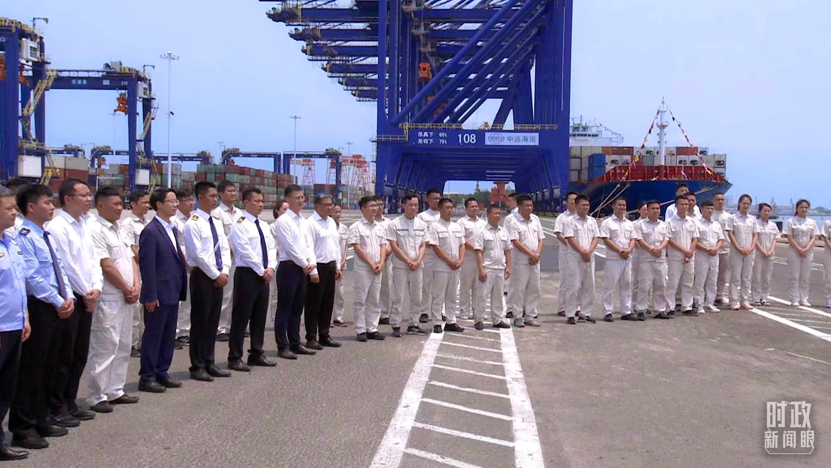 △這是當(dāng)天在小鏟灘港區(qū)的現(xiàn)場(chǎng)作業(yè)人員、掛職干部代表等。(總臺(tái)央視記者馬超拍攝)