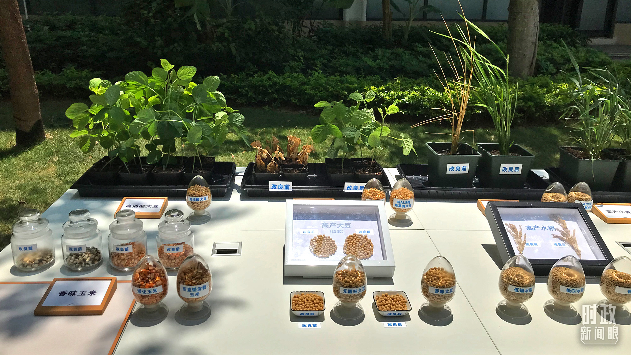 △崖州灣種子實(shí)驗(yàn)室,玉米、大豆和水稻改良前后的對(duì)比樣品。(總臺(tái)央視記者石偉明拍攝)