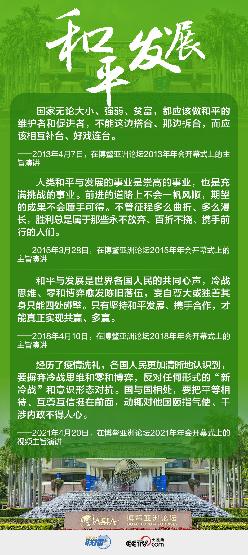世界正處于大發(fā)展大變革大調(diào)整時(shí)期,和平與發(fā)展仍然是時(shí)代主題。在博鰲亞洲論壇這一具有世界影響力的高層次對(duì)話平臺(tái)上,習(xí)近平主席多次就此作出重要論述。