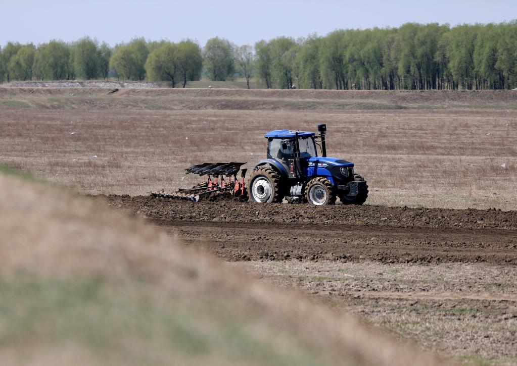 2022年4月22日,在遼寧省臺安縣達(dá)牛鎮(zhèn)十四家子村大豆基地,農(nóng)機(jī)手駕駛農(nóng)機(jī)對農(nóng)田進(jìn)行翻耕。新華社記者 姚劍鋒 攝