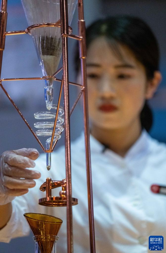 云南勐海大益茶庭的茶藝師陳夷在制作冰滴普洱茶(5月10日攝)。新華社記者江文耀攝