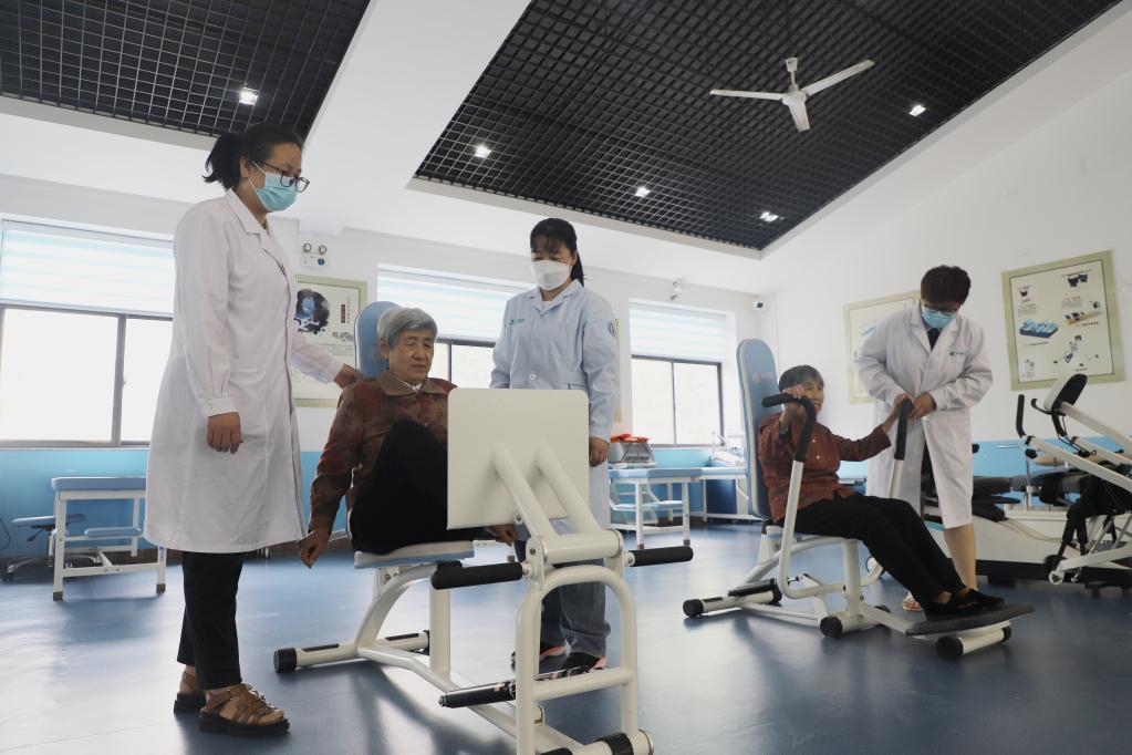 5月27日,在山東省博興縣呂藝鎮(zhèn)老年公寓醫(yī)養(yǎng)康復(fù)中心,醫(yī)護人員指導(dǎo)農(nóng)村老人利用專業(yè)器械進行康復(fù)鍛煉。(博興縣委宣傳部供圖)