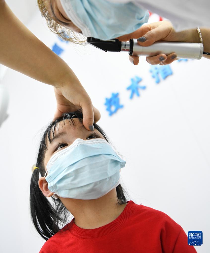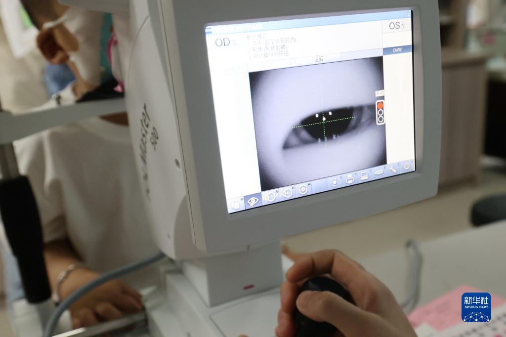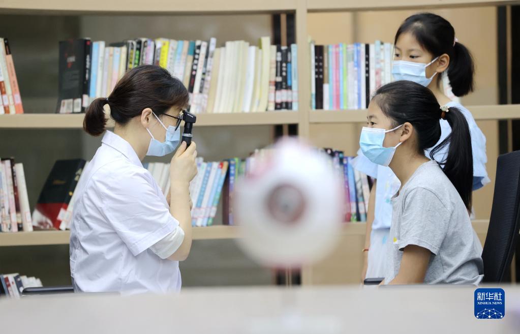 6月5日,在浙江省湖州市德清縣武康街道新豐未來(lái)社區(qū),醫(yī)務(wù)人員為社區(qū)兒童檢查視力。新華社發(fā)(謝尚國(guó) 攝)