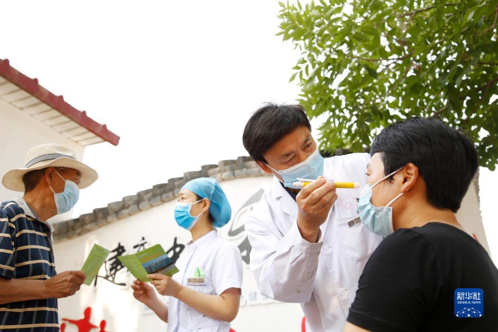 6月5日,河北省邢臺(tái)市南和區(qū)人民醫(yī)院醫(yī)務(wù)人員深入鄉(xiāng)村開展基層義診活動(dòng),為賈宋鎮(zhèn)蘇史張村村民檢查眼睛。新華社發(fā)(張馳 攝)