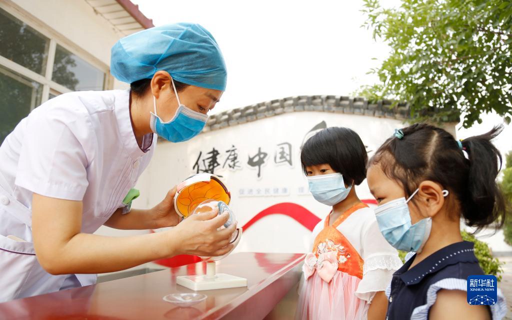 6月5日,河北省邢臺(tái)市南和區(qū)人民醫(yī)院醫(yī)務(wù)人員深入鄉(xiāng)村開展基層義診活動(dòng),為賈宋鎮(zhèn)蘇史張村小朋友講解眼睛的結(jié)構(gòu)和功能。新華社發(fā)(張馳 攝)
