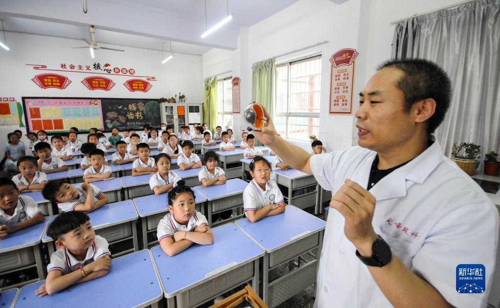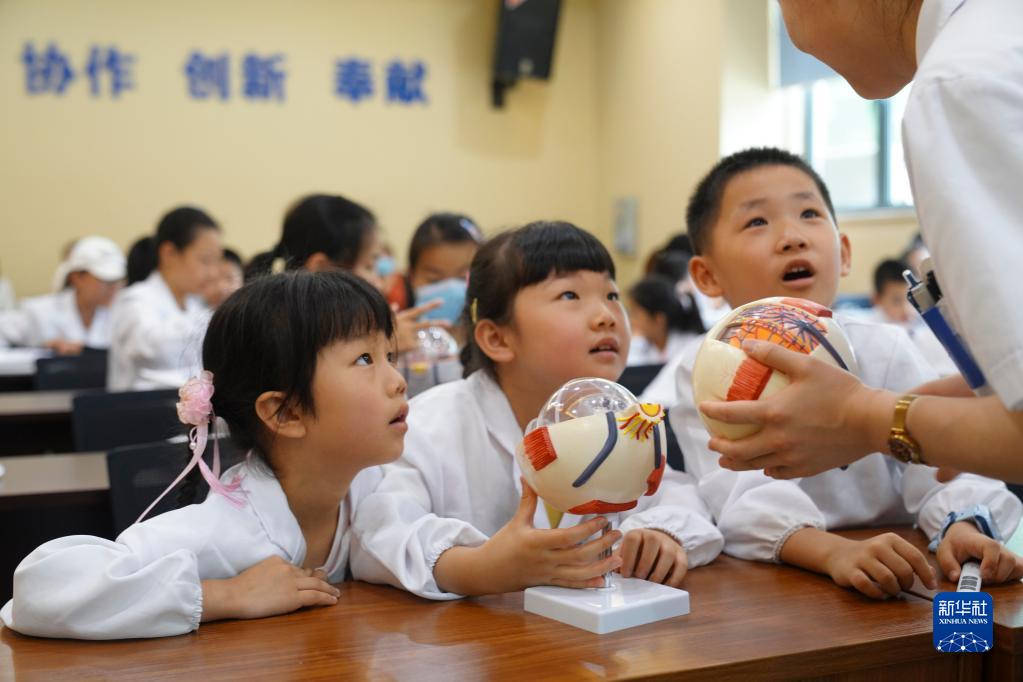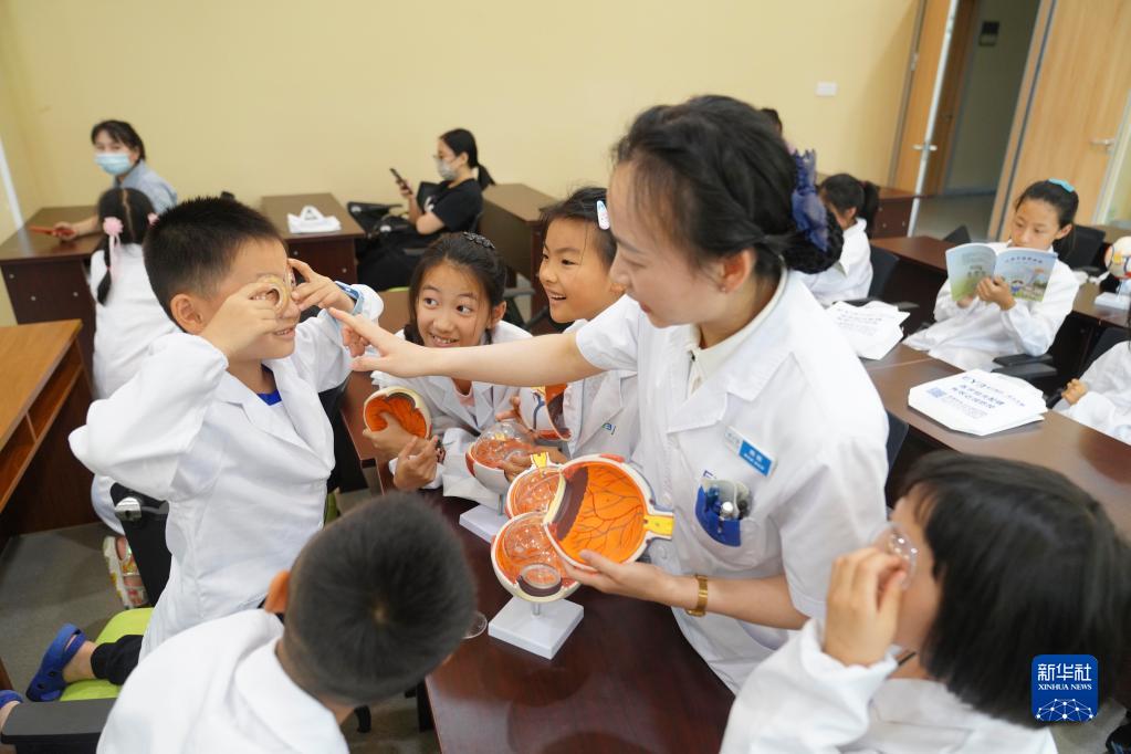6月5日,在重慶市北碚區(qū)一家眼科醫(yī)院,一名驗(yàn)光師在給孩子們講解眼球構(gòu)造知識(shí)。新華社發(fā)(秦廷富 攝)
