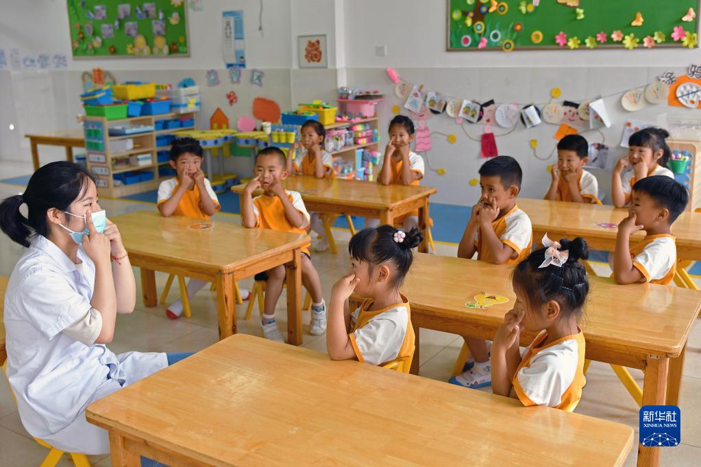 6月5日,在山東省煙臺(tái)市福山區(qū)一家幼兒園,醫(yī)務(wù)人員指導(dǎo)小朋友做眼保健操。新華社發(fā)(孫文潭 攝)
