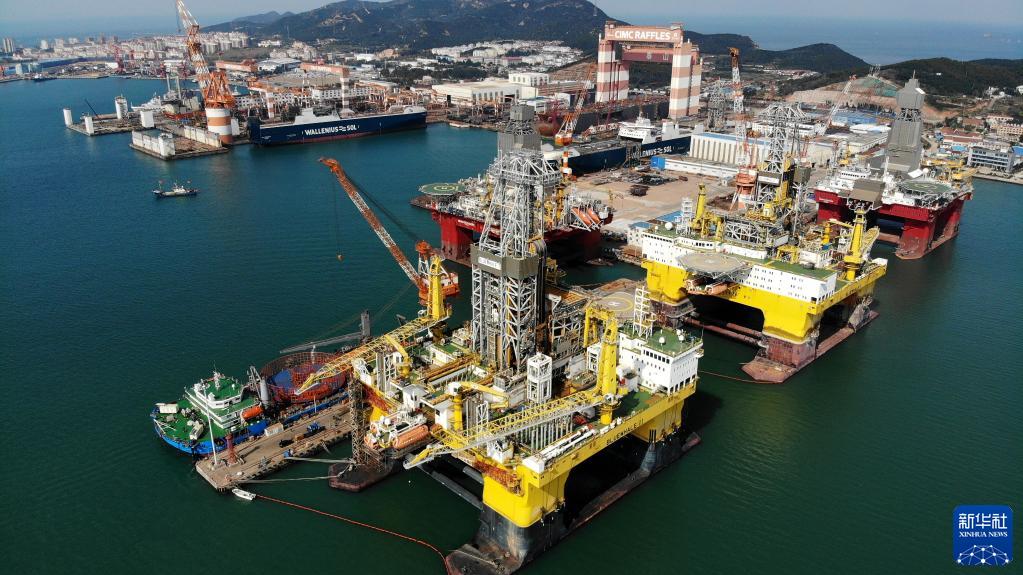 “藍(lán)鯨1號”(前右)及姊妹平臺(tái)“藍(lán)鯨2號”(前左)在其生產(chǎn)基地中集來福士海洋工程有限公司煙臺(tái)基地進(jìn)行維護(hù)和保養(yǎng)(2021年10月18日攝,無人機(jī)照片)。新華社記者李紫恒攝