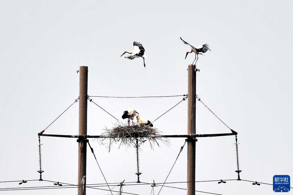 這是山東黃河三角洲國家級自然保護(hù)區(qū)電線桿上的東方白鸛的巢(2021年5月13日攝)。新華社記者郭緒雷攝