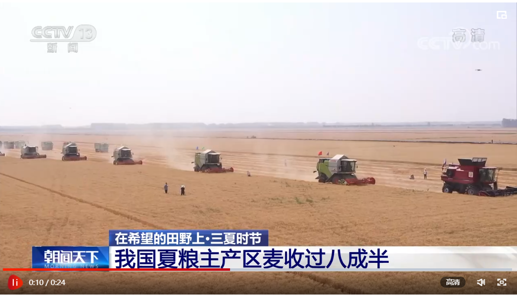 央視網(wǎng)消息:農(nóng)業(yè)農(nóng)村部在昨天(6月15日)發(fā)布的小麥機收進度顯示,全國已收獲小麥面積2.62億畝,收獲進度86%。
