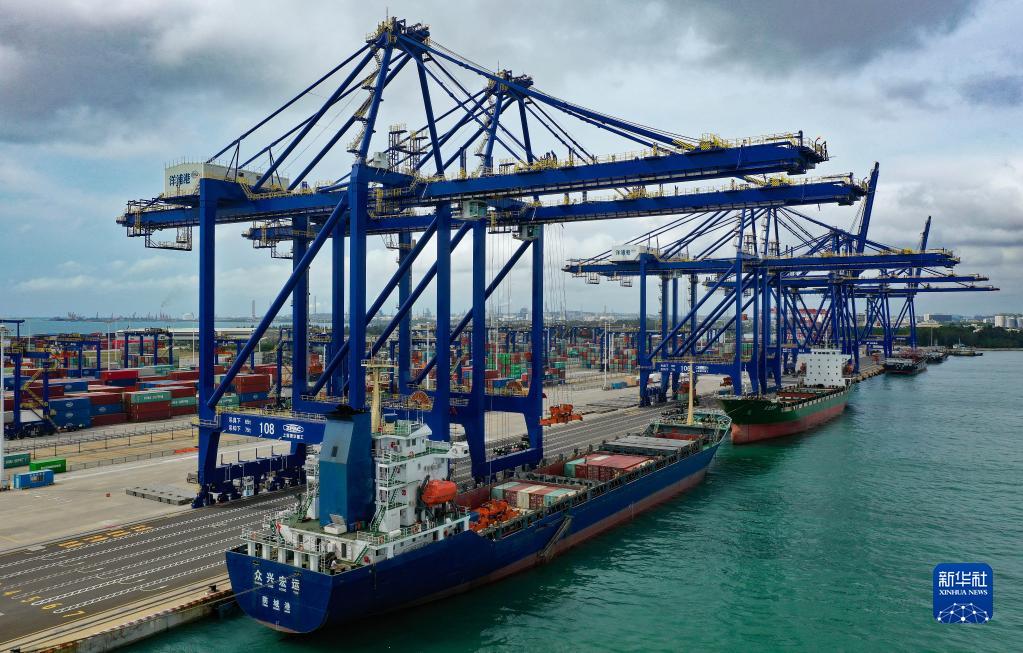 6月15日,集裝箱貨輪在海南洋浦國(guó)際集裝箱碼頭裝卸貨物(無人機(jī)照片)。新華社記者 郭程 攝