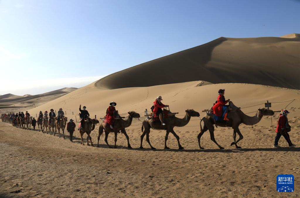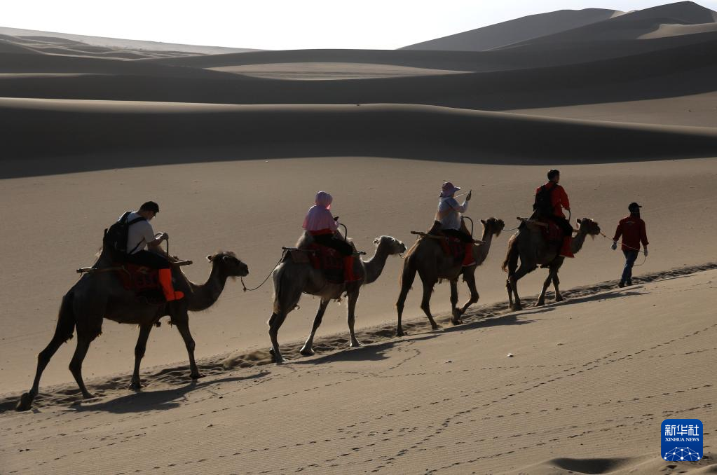 6月19日,游客在甘肅省敦煌市鳴沙山月牙泉景區(qū)騎駱駝?dòng)斡[。新華社發(fā)(張曉亮 攝)