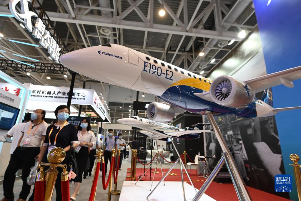 參觀者從2021金磚國(guó)家新工業(yè)革命展展出的飛機(jī)模型前走過(2021年9月8日攝)。新華社記者 林善傳 攝