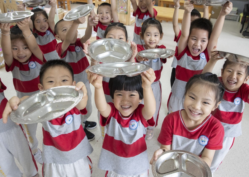 ↑浙江省諸暨市濱江幼兒園小朋友在午餐時(shí)比賽誰(shuí)吃得最干凈(2021年10月14日攝)。