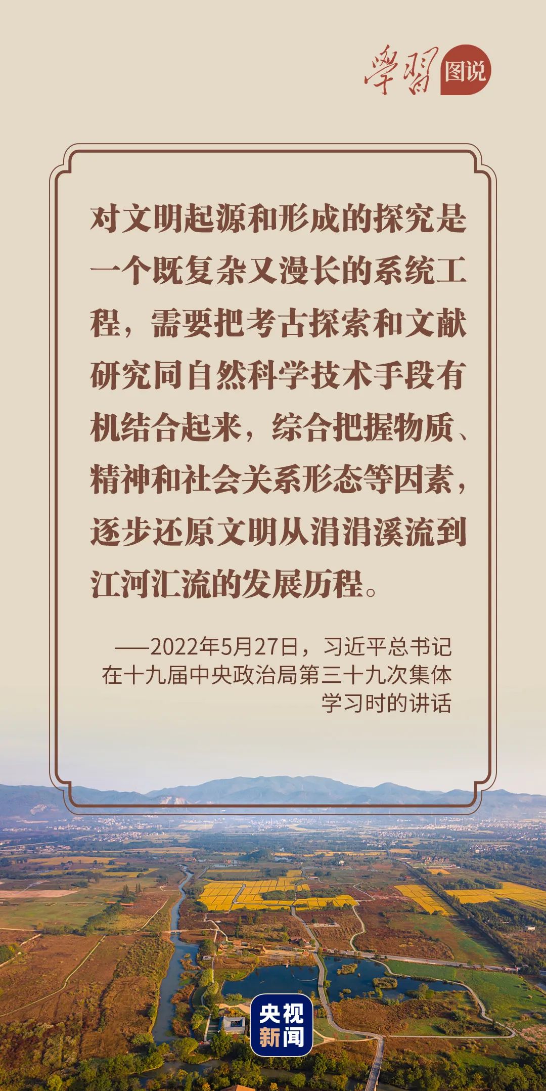 “深入了解中華文明五千多年發(fā)展史,推動(dòng)把中國(guó)文明歷史研究引向深入,推動(dòng)全黨全社會(huì)增強(qiáng)歷史自覺(jué)、堅(jiān)定文化自信,堅(jiān)定不移走中國(guó)特色社會(huì)主義道路,為全面建設(shè)社會(huì)主義現(xiàn)代化國(guó)家、實(shí)現(xiàn)中華民族偉大復(fù)興而團(tuán)結(jié)奮斗。”