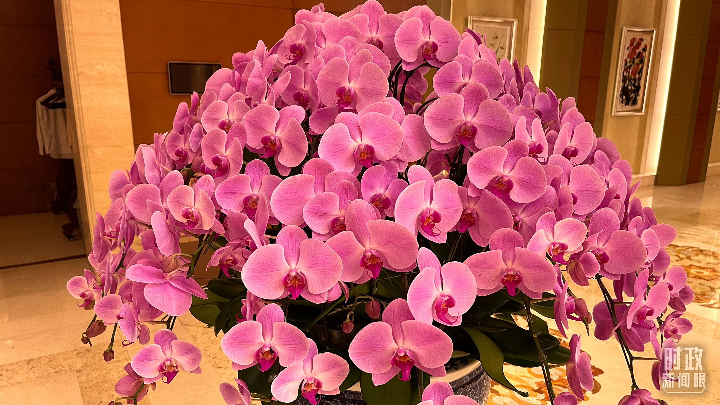 △釣魚(yú)臺(tái)國(guó)賓館芳華苑內(nèi)擺放的蝴蝶蘭,印尼是蝴蝶蘭的重要產(chǎn)地之一。(總臺(tái)央視記者鄂介甫拍攝)