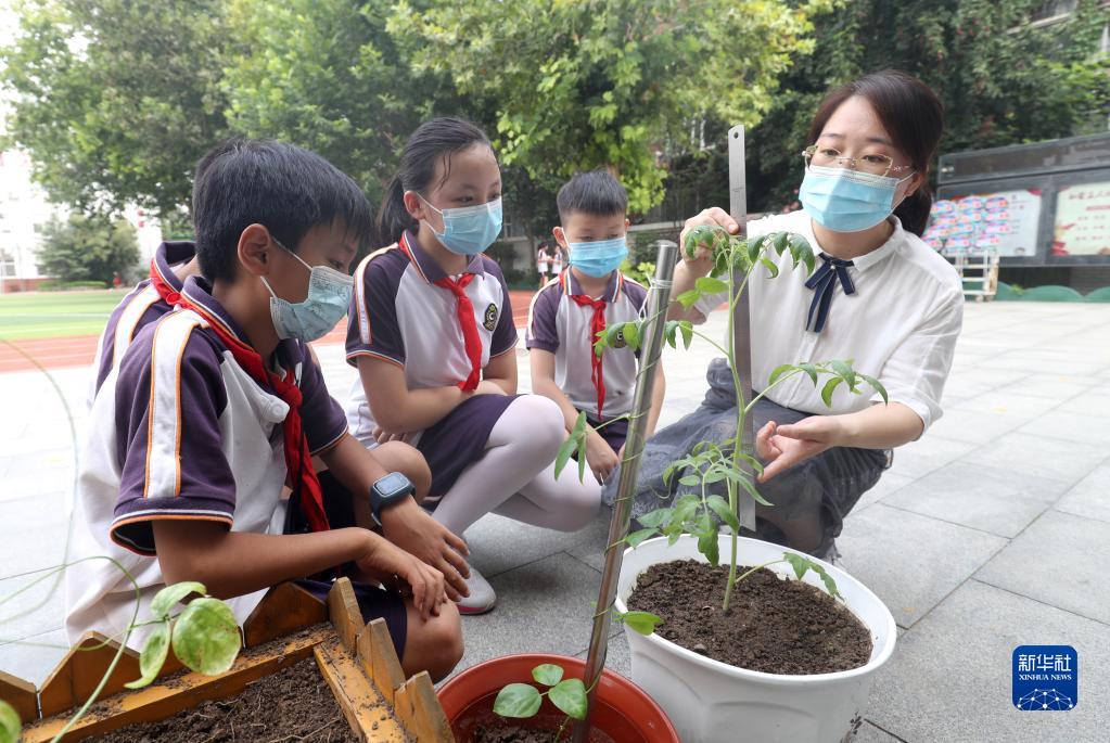8月3日,在河北省石家莊市長(zhǎng)安東路小學(xué),老師(右一)為學(xué)生們測(cè)量太空種子植株。新華社發(fā)(梁子棟攝)