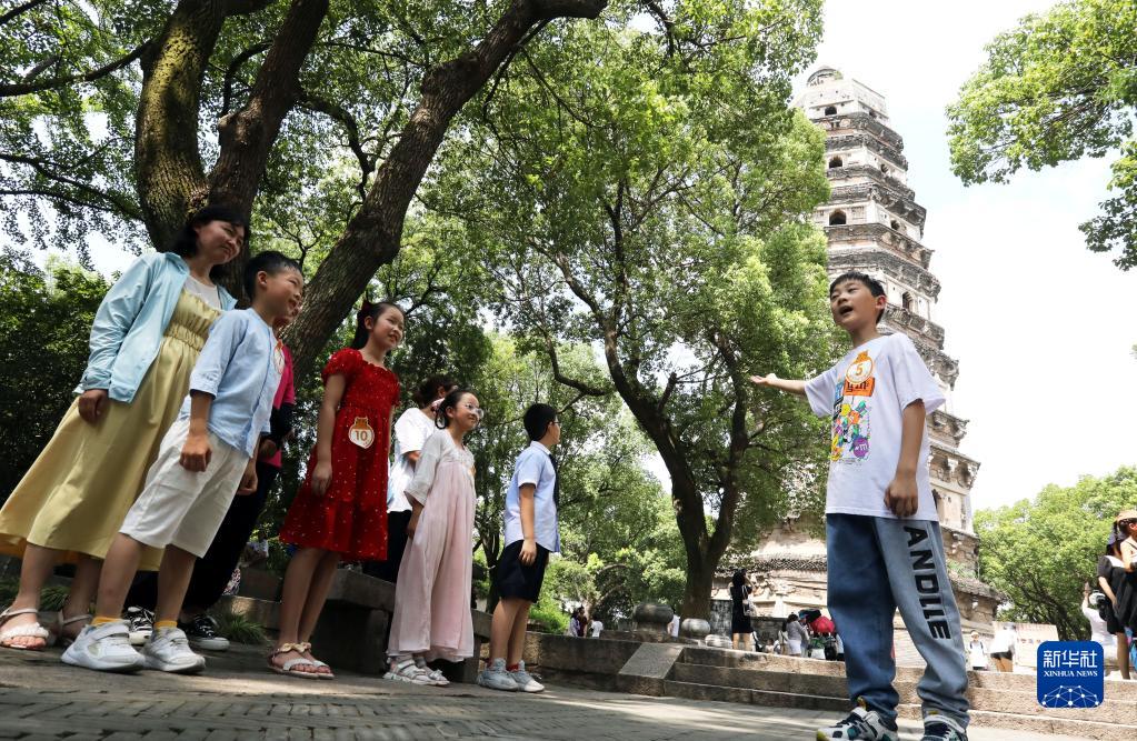 8月3日,在江蘇蘇州虎丘景區(qū),一名孩子在體驗(yàn)“小小講解員”上崗實(shí)踐。新華社發(fā)(杭興微 攝)