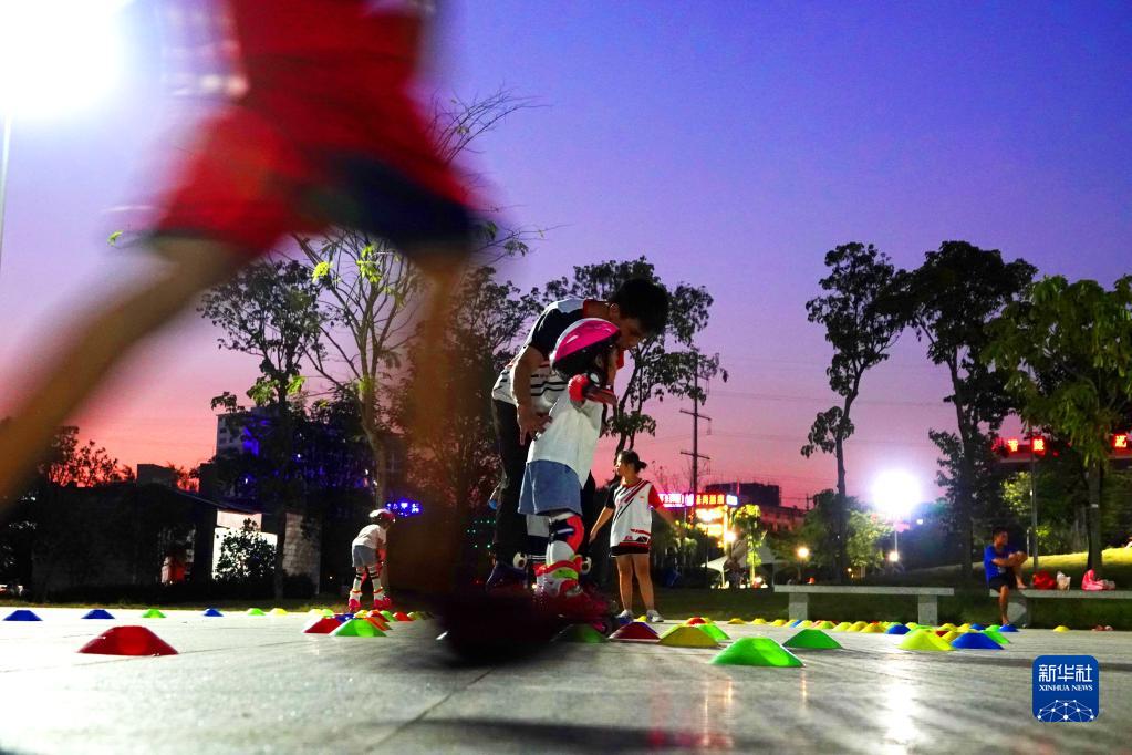 8月2日,在廣西南寧市明月湖濕地公園,孩子們?cè)诮叹毜闹笇?dǎo)下進(jìn)行輪滑訓(xùn)練。新華社發(fā)(喻湘泉攝)
