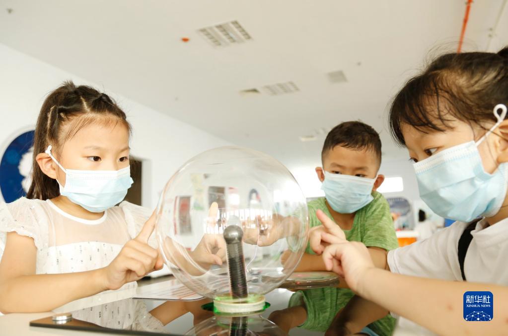 8月3日,在河北省邢臺(tái)市南和區(qū)科技館,賈宋鎮(zhèn)南師村的孩子們?cè)趯W(xué)習(xí)科普知識(shí)。新華社發(fā)(張馳攝)