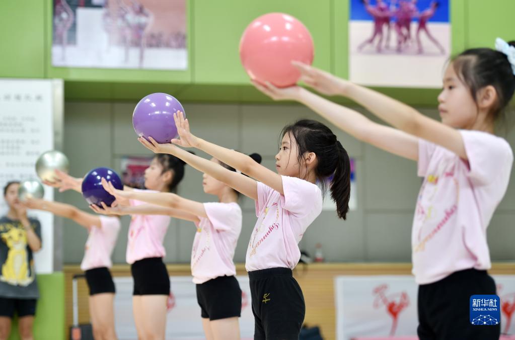 8月3日,在河北省石家莊市裕華區(qū)的一家體育訓(xùn)練館,學(xué)習(xí)藝術(shù)體操的孩子們?cè)诳炭嘤?xùn)練。新華社發(fā)(張曉峰攝)