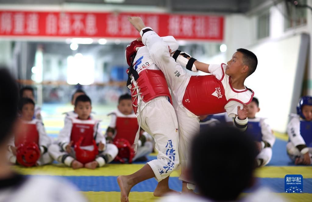 8月3日,孩子們?cè)谫F州省黔東南苗族侗族自治州丹寨縣一家跆拳道館練習(xí)跆拳道。新華社發(fā)(黃曉海 攝)