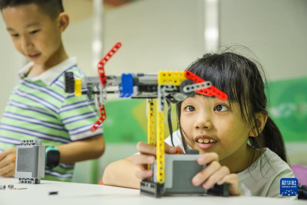 8月2日,在湖南省永州市藍(lán)山縣一培訓(xùn)學(xué)校,孩子們?cè)隗w驗(yàn)機(jī)器人編程。新華社發(fā)(彭華攝)