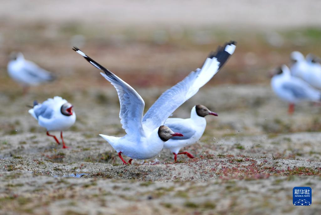瑪旁雍錯湖邊的棕頭鷗(8月2日攝)。新華社記者 張汝鋒 攝