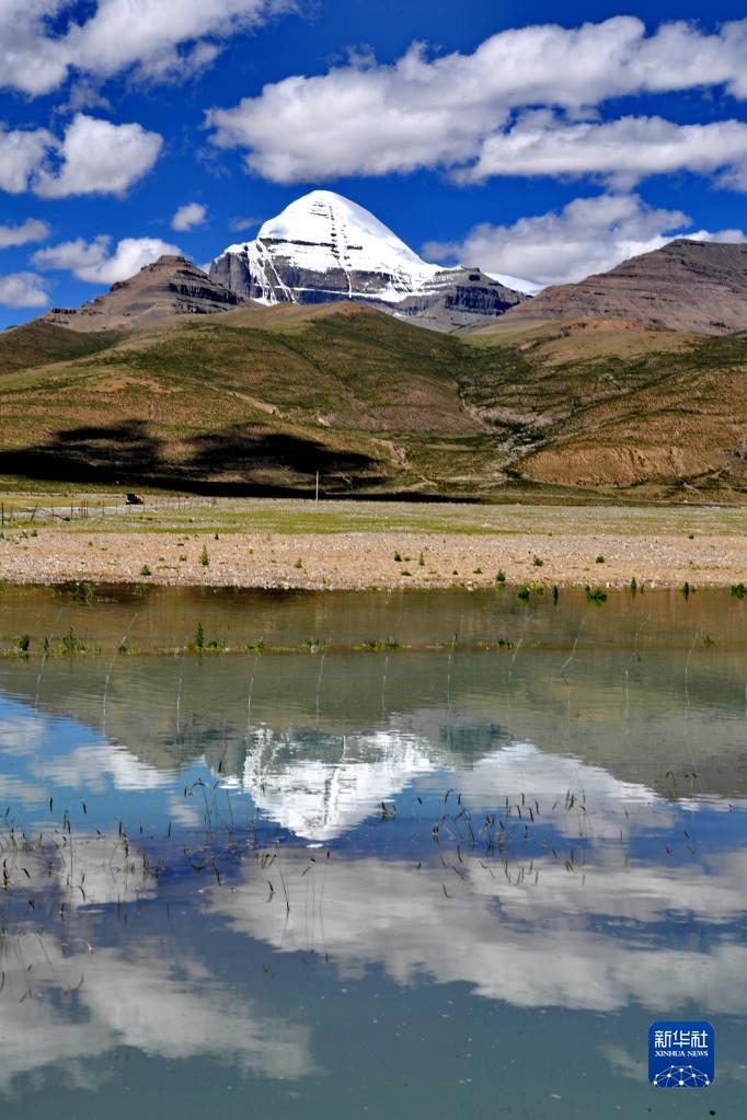 岡仁波齊峰倒映在水面(8月2日攝)。新華社記者 張汝鋒 攝