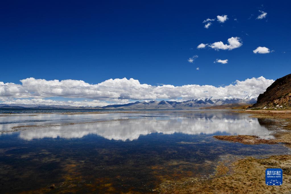 藍天白云下的瑪旁雍錯(8月2日攝)。新華社記者 張汝鋒 攝