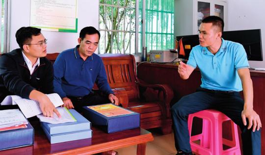 在海南省瓊中黎族苗族自治縣灣嶺鎮(zhèn)加章村委會(huì),紀(jì)檢監(jiān)察干部(左一)在查閱鄉(xiāng)村振興及村級(jí)財(cái)務(wù)支出相關(guān)材料(2021 年 11 月13 日攝) 楊冠宇攝 / 本刊