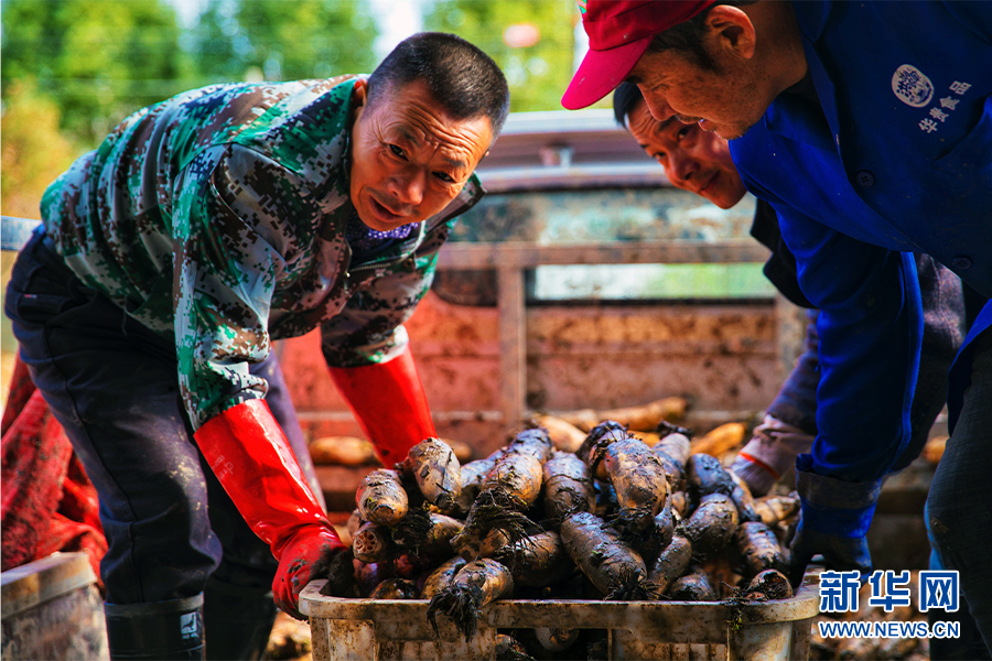 圖為藕農正在往加工工廠運送自己采收的新鮮蓮藕。新華網發(fā)(受訪者提供)