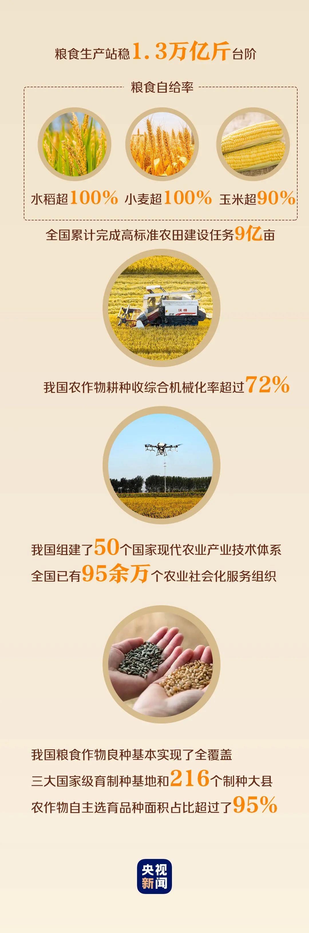 黨的十八大以來,以習(xí)近平同志為核心的黨中央始終把糧食安全作為治國理政的頭等大事。我們時(shí)刻緊繃糧食安全這根弦,著力穩(wěn)面積、提單產(chǎn)、強(qiáng)產(chǎn)能,調(diào)動(dòng)農(nóng)民種糧積極性,實(shí)施“藏糧于地、藏糧于技”戰(zhàn)略,糧食生產(chǎn)實(shí)現(xiàn)連年豐收,為應(yīng)對(duì)各種風(fēng)險(xiǎn)挑戰(zhàn)、實(shí)現(xiàn)我國經(jīng)濟(jì)社會(huì)穩(wěn)定發(fā)展筑牢了“壓艙石”。