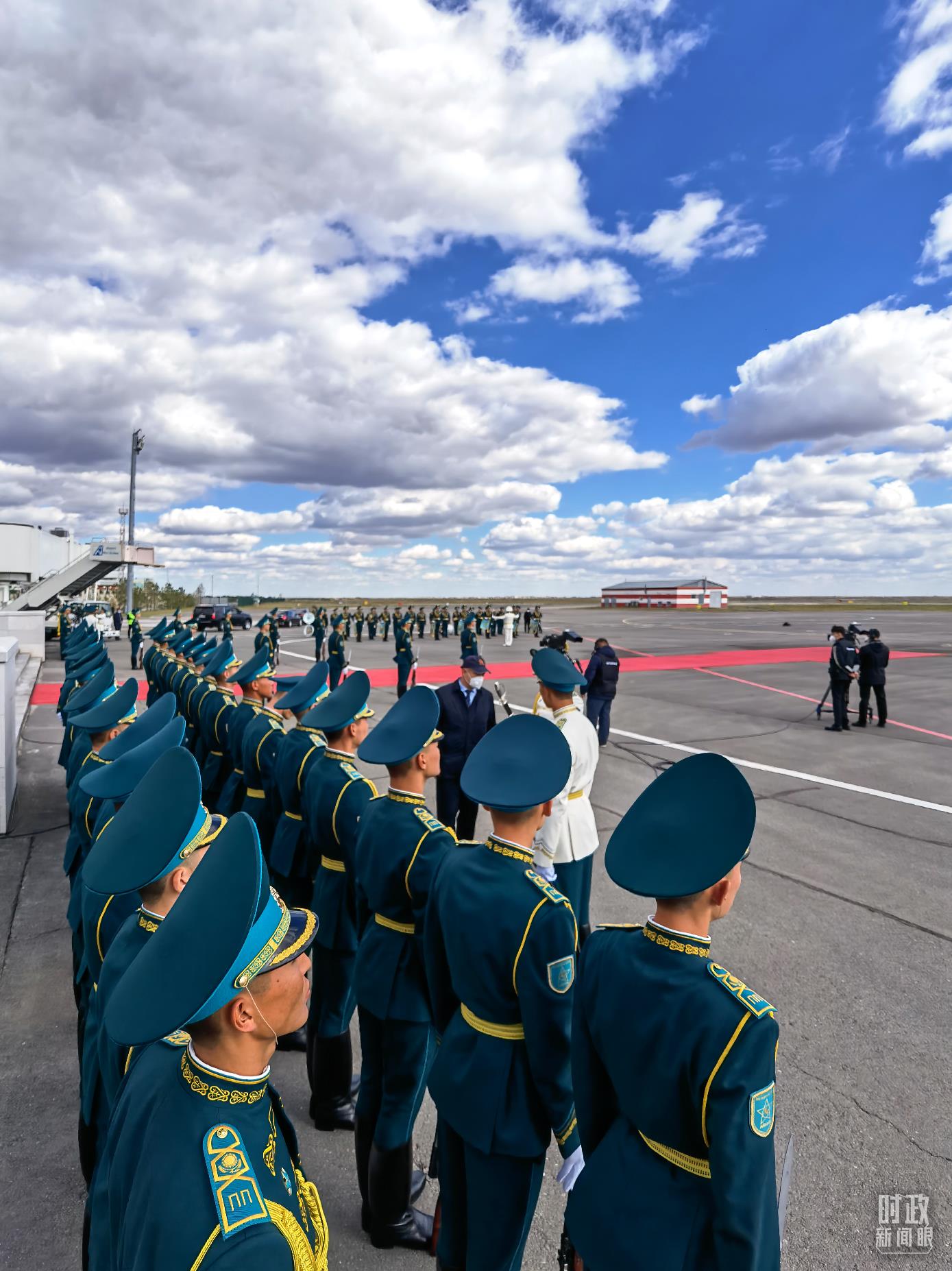 托卡耶夫總統(tǒng)親自前往機(jī)場(chǎng)迎接?,F(xiàn)場(chǎng)70余名禮兵分列兩側(cè)致敬,軍樂(lè)團(tuán)奏迎賓號(hào)角。