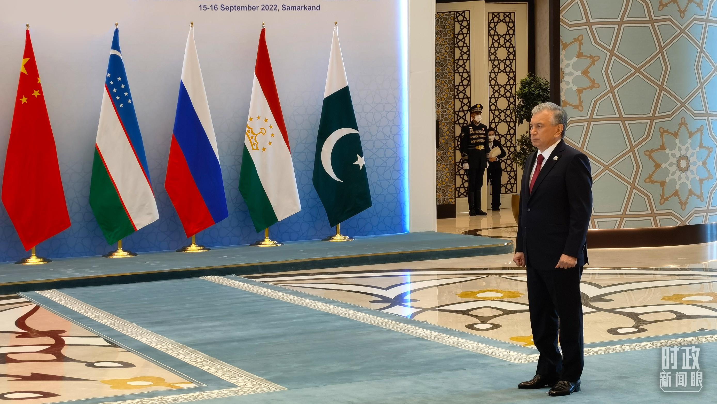 當(dāng)天上午,烏茲別克斯坦總統(tǒng)米爾濟(jì)約耶夫作為主席國(guó)元首提前來到現(xiàn)場(chǎng),準(zhǔn)備迎接各國(guó)領(lǐng)導(dǎo)人的到來。