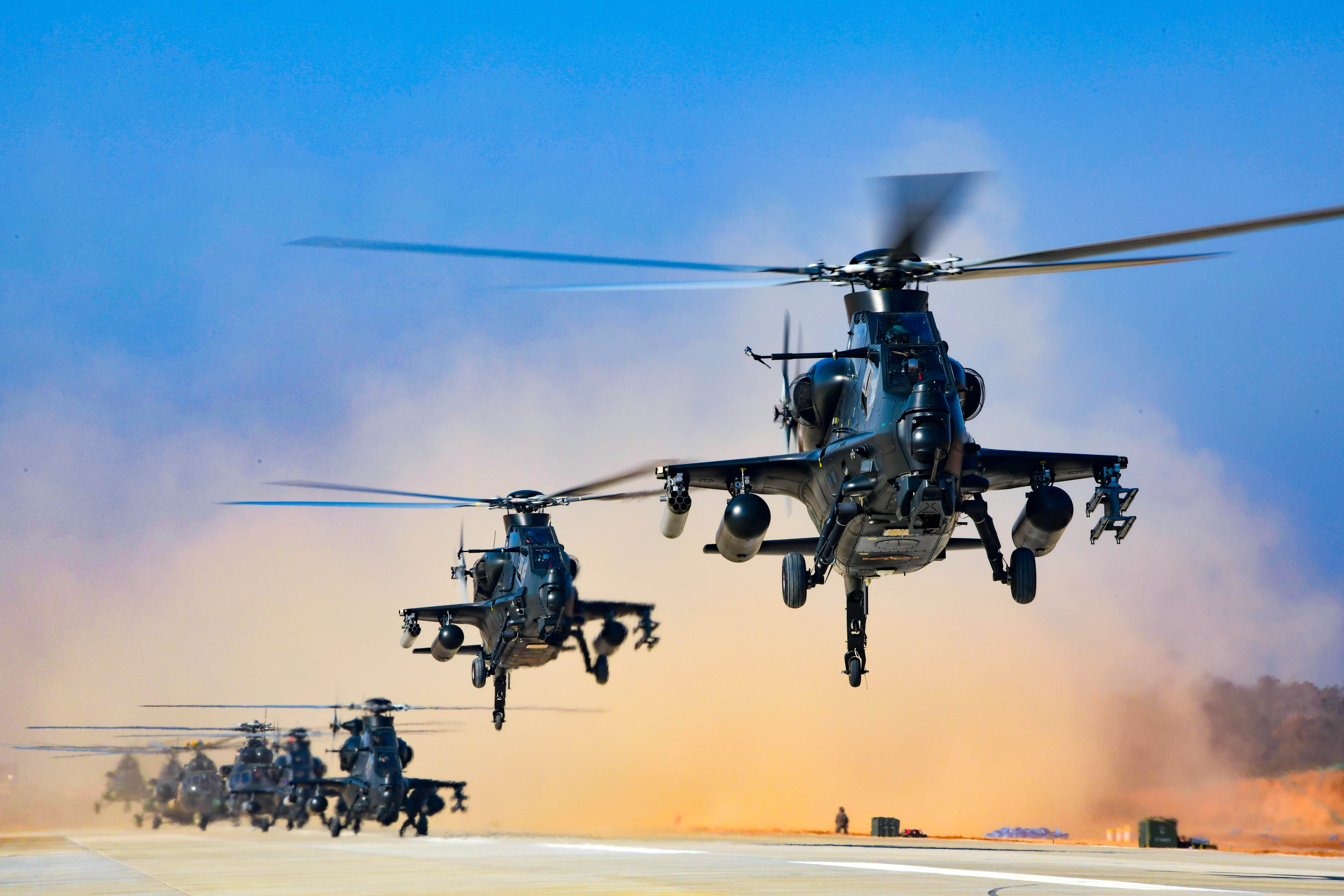 陸軍第73集團(tuán)軍某陸航旅組織飛行訓(xùn)練,戰(zhàn)機(jī)編隊(duì)依次起飛(2021年4月22日攝)。新華社發(fā)(李士龍 攝)