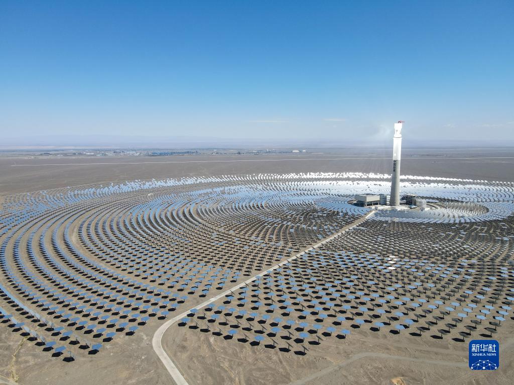 在新疆伊吾縣淖毛湖鎮(zhèn)拍攝的哈密50兆瓦熔鹽塔式光熱發(fā)電站(2021年8月22日攝,無人機照片)。作為新疆第一座光熱發(fā)電站,哈密50兆瓦熔鹽塔式光熱發(fā)電站不僅污染物零排放,還通過儲存熱能實現24小時持續(xù)發(fā)電。新華社記者 高晗 攝