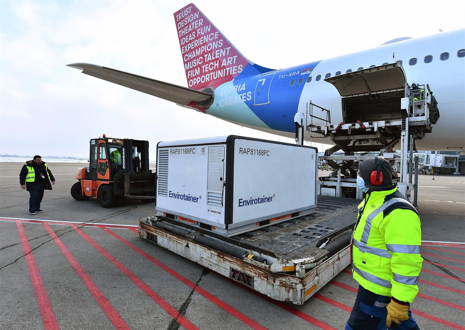 2021年1月16日,在塞爾維亞首都貝爾格萊德,機(jī)場(chǎng)工作人員卸載由中國(guó)國(guó)藥集團(tuán)生產(chǎn)的新冠疫苗。新華社發(fā)(普雷德拉格·米洛薩夫列維奇攝)