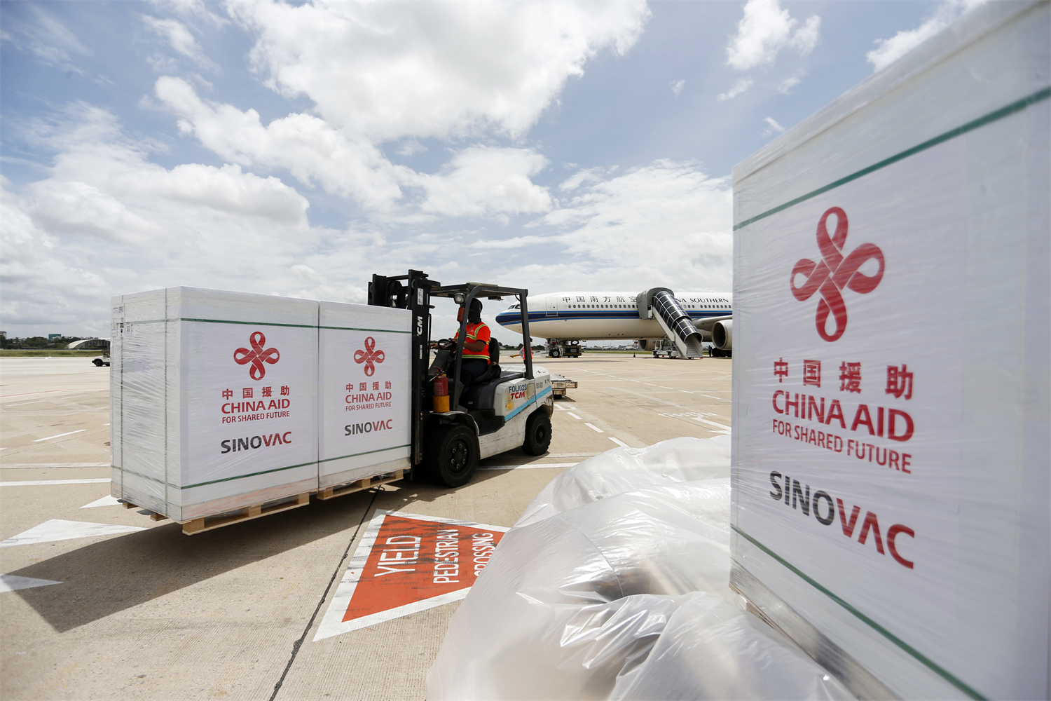 2021年10月14日,工作人員在柬埔寨金邊國(guó)際機(jī)場(chǎng)運(yùn)輸中國(guó)政府援助柬埔寨的科興新冠疫苗。新華社發(fā)(批隆攝)
